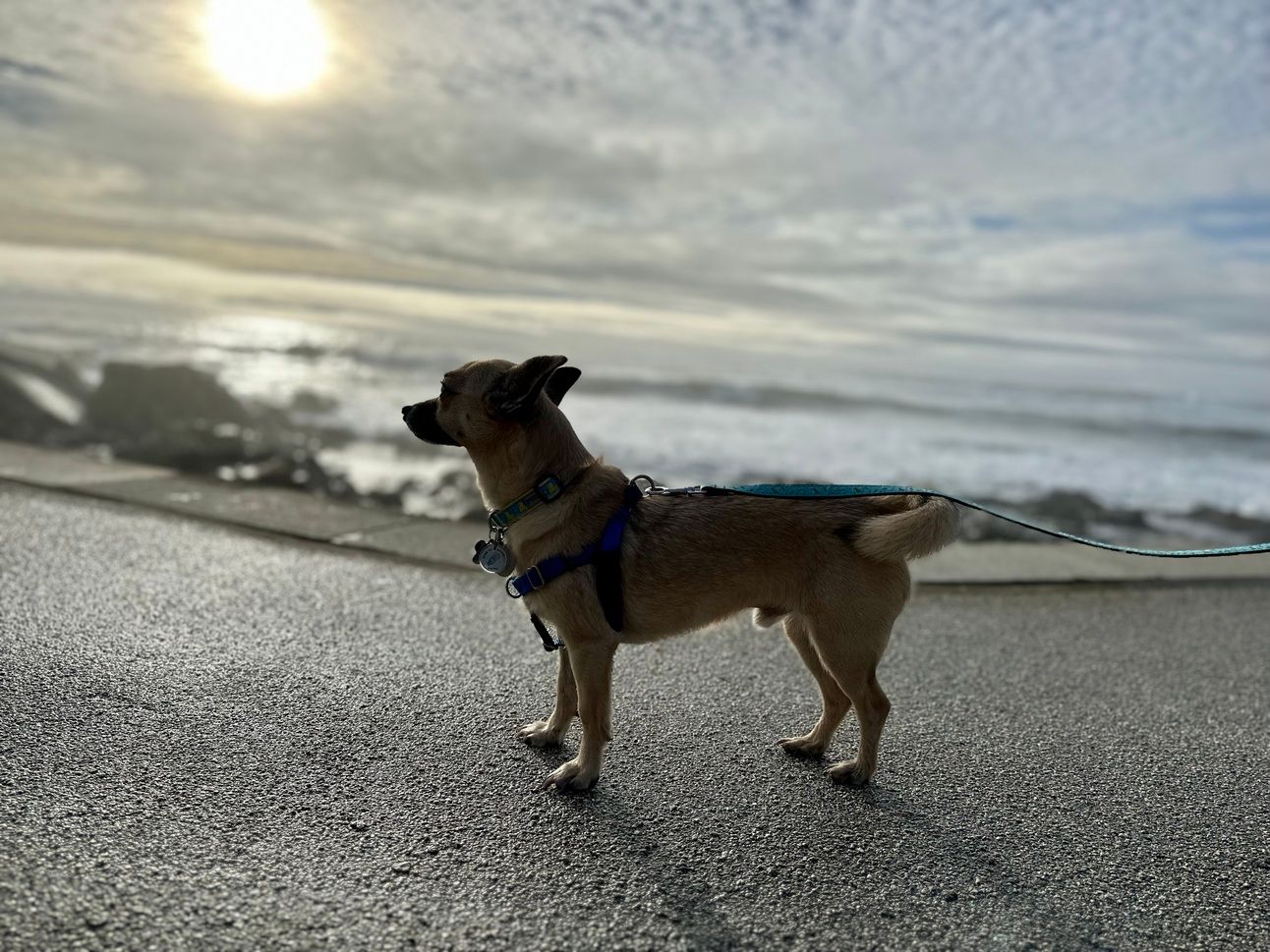 My spoiled rotten chihuahua mix Kodak taking in the Atlantic Ocean at the Portuguese coast