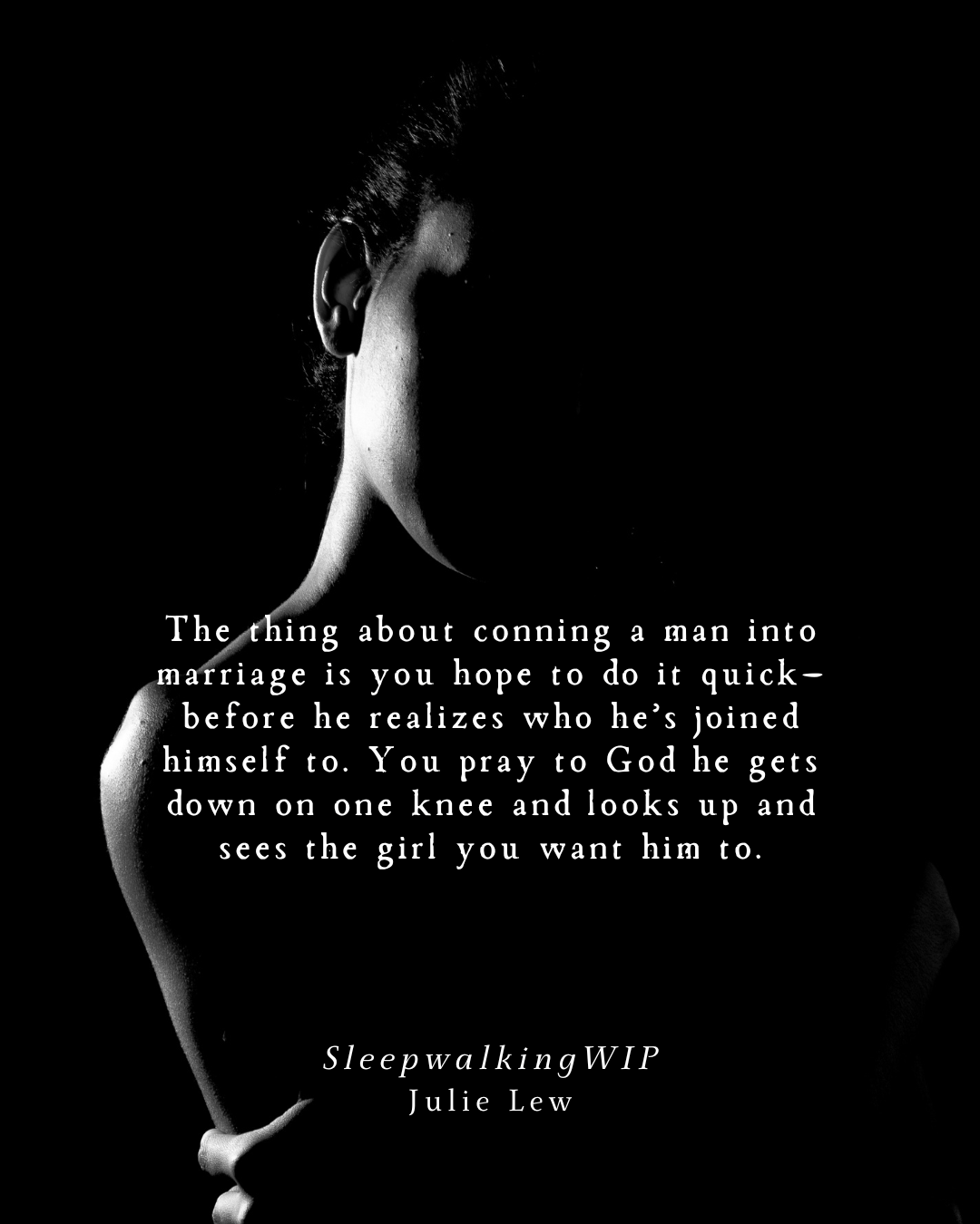 For context, SleepwalkingWIP is set in the 1930s and follows Hellie, a biracial con artist, who tricks her way down the aisle with a wealthy widower to escape the ravages of the Great Depression. She’s used to curating her appearance and passing as white for others’ consumption, but now her stability and safety depend on her husband never discovering the truth.